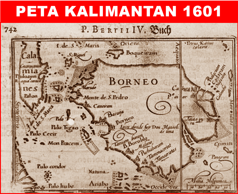 Tahun 1601 gambar peta Borneo bentuknya sama sekali dengan tiga peta sebelumnya. Jika sebelumnya cenderung miring ke kanan, tetapi pada tahun ini justru miring ke sebaliknya
