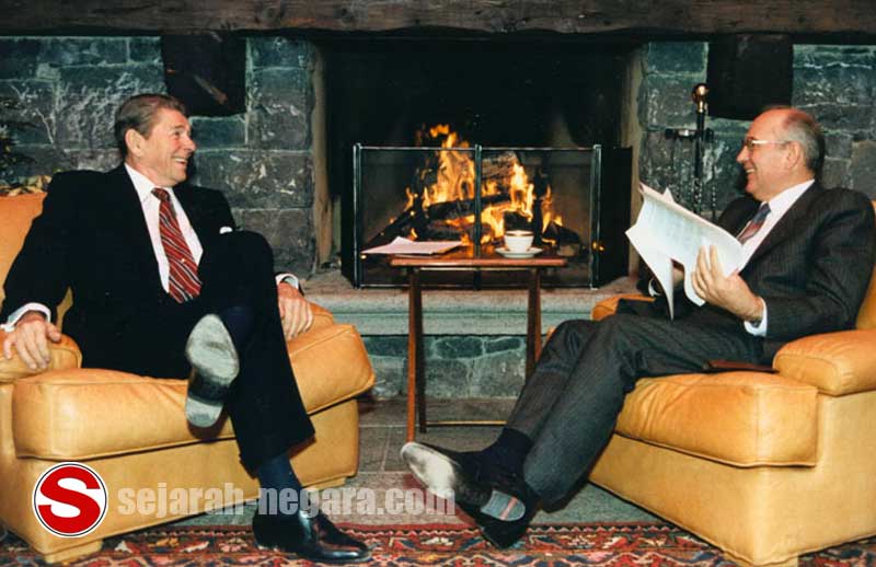 | Presiden AS Ronald Reagan (kiri) dan Sekretaris Jenderal Soviet Mikhail Gorbachev, bertemu di Jenewa pada tahun 1985. |