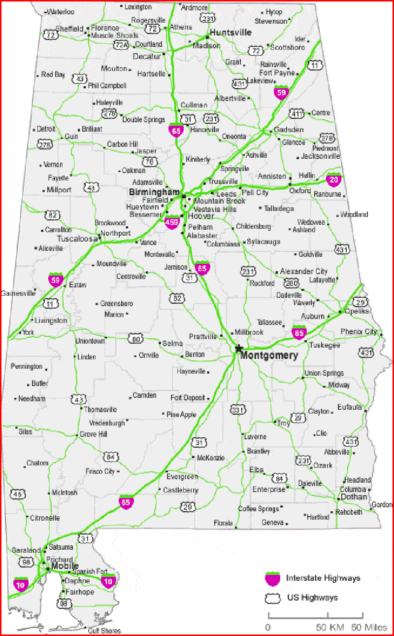 Alabama Cities and Roads Map