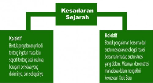 Kesadaran sejarah dapat dialami secara perseorangan yang tercermin dalam memori. Namun, yang lebih penting adalah kesadaran sejarah bersifat kolektif (kelompok), yaitu : suatu bentuk pengelaman bersama suatu masyarakat sebagai ungkapan reaksi mereka kepada situasi, baik suatu kebudayaan, politik maupun ekonomi pada masa satu ke masa lain.