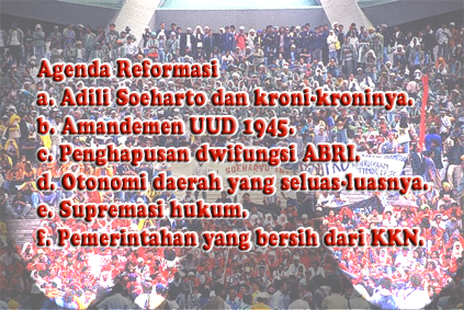 Melihat situasi politik dan kondisi ekonomi Indonesia yang semakin tidak terkendali, rakyat Indonesia kemudian menyatakan bahwa pemerintahan Orde Baru tidak berhasil menciptakan negara yang adil dan makmur berdasarkan Pancasila dan UUD 1945. Atas kesadaran itu, rakyat bersama-sama dengan para mahasiswa mengadakan suatu gerakan yaitu gerakan reformasi.