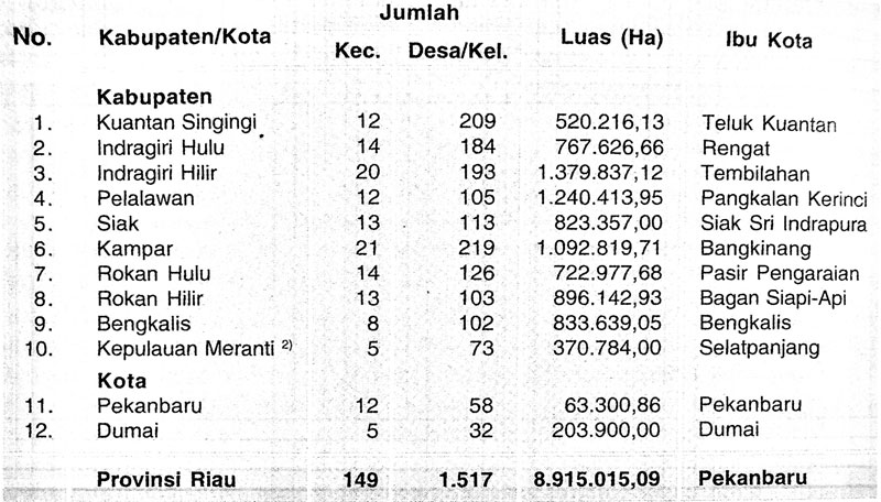 Perhatikan Tabel Data Wilayah Provinsi Riau Tahun 2007 di bawah ini: