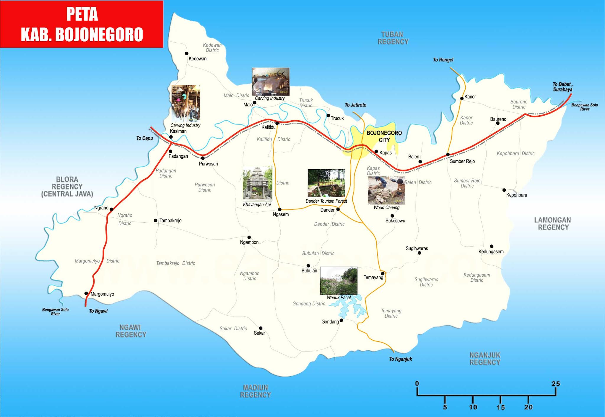 Lalu sebenarnya di mana letak Kab. Bojonegoro jika di lihat dari peta Jawa Timur secara keseluruhan? Nah, peta lokasi di bawah ini adalah jawabannya. Bisa anda lihat bahwa kabupaten tersebut letaknya berbatasan langsung dengan provinsi Jawa Tengah.
