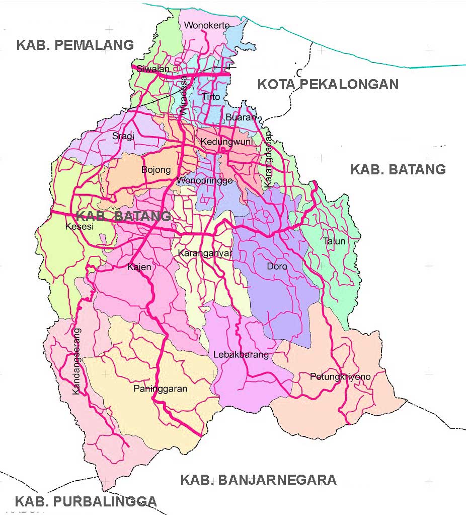 Dari peta di atas dapat kita ketahui secara rinci 19 Kecamatan di Kabupaten Pekalongan, baik nama kecamatan, letak letak dan batas-batasnya.