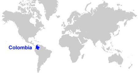 Lokasi Kolombia: Amazonas (Sungai Amazon), Bahia de Buenaventura, Bahia de Portete, Bahia Guapi, Bahia Honda, Sungai Caguan, Sungai Caqueta, Laut Karibia, Cordillera de los Andes, Ensenada de Tumaco, Ensenada Docampado, Golfo de Cupica, Golfo de Morrosquillo, Golfo de Tibuga, Golfo de Uraba, Sungai Guaviare, Sungai Inirida, Laguna de la Cocha, Sungai Magdalena, Sungai Orinoco, Samudra Pasifik, Rio Atrato, Rio Caqueta, Rio Cauca, Rio Guainia, Rio Guaviare, Rio Magdalena, Rio Meta, Rio Putumayo dan Rio Vaupes.