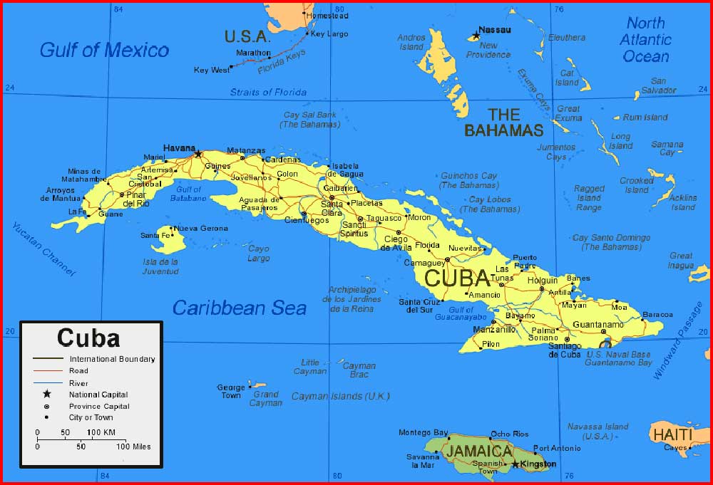 Peta Kuba – Kuba atau nama resminya Republik Kuba merupakan sebuah negara yang terdiri dari pulau Kuba, dan Isla de la Juventud dan beberapa kepulauan kecil lainnya. Letaknya di Karibia bagian utara pada pertemuan Laut Karibia, Teluk Meksiko dan Samudra Atlantik.
