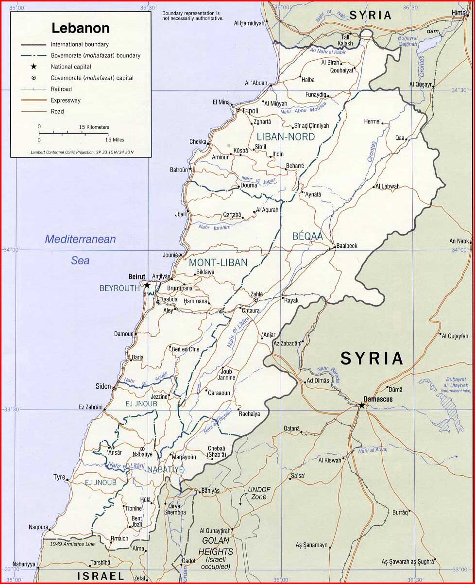 Kota Penting: Al ‘Aridah, Al Minyah, Anfah, As Sarafand, Baalbeck, Batroun, Baynu, Beyrouth (Beirut), El Mina, Halba, Hasbayya, Hermel, Jbail, Jezzine, Jounie, Kousha, Machghara, Nagoura, Qiryat Shemona, Qoubalyat, Saida (Sidon), Sir ad Dinniyah, Sour (Tyre), Trablous (Tripoli), Yunin, Zahlah and Zgharta.