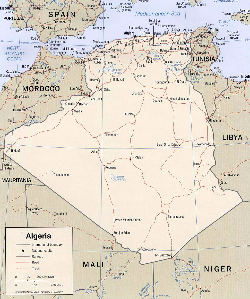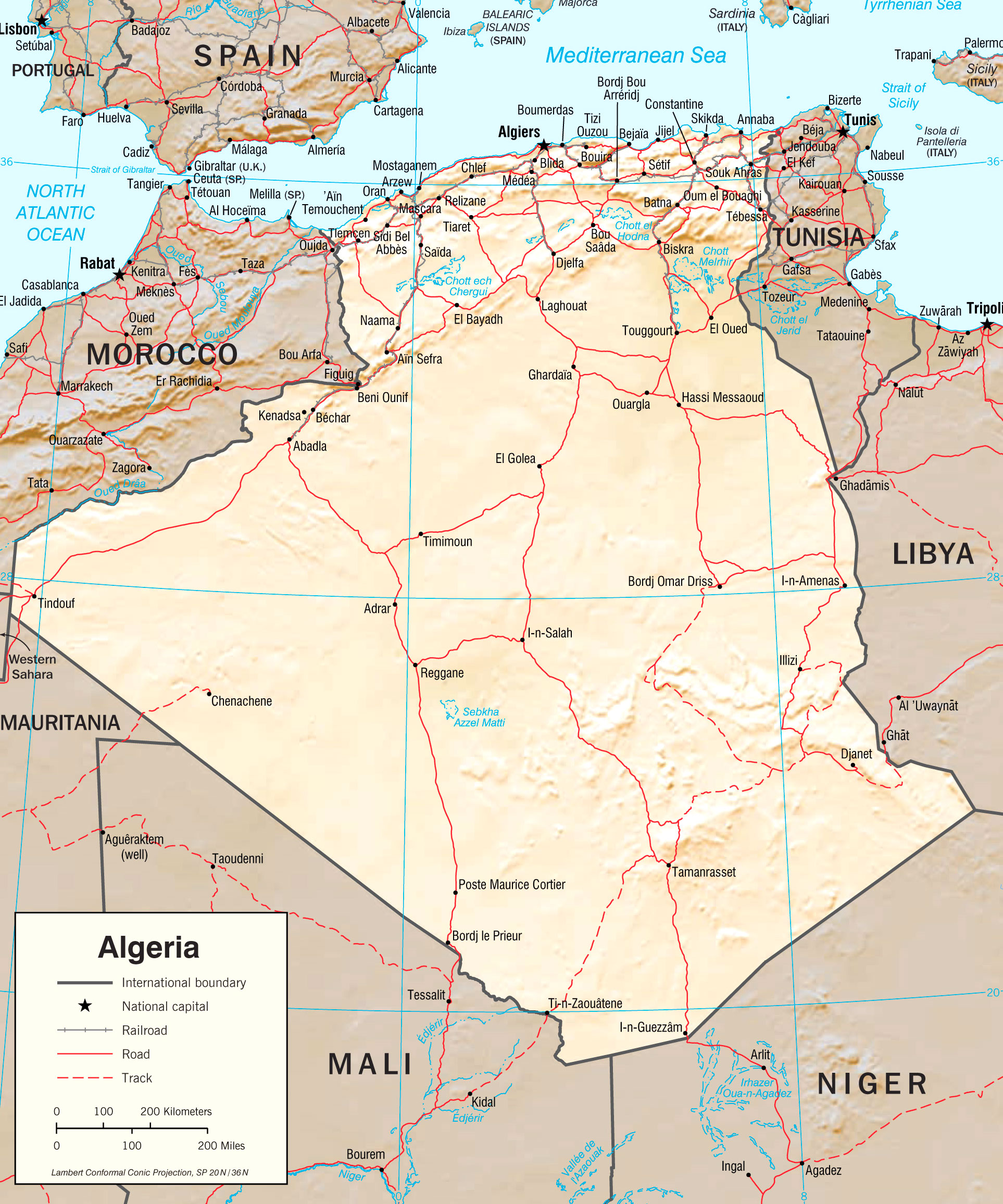 Kota penting Algeria: Adrar, Ain Temouchent, Algeria (Aljir), Annaba (Tulang), Batna, Bechar, Bejaia, Bejaia (Bougie), Biskra, Blida, Bou Saada, Constantine, Dellys, Djelfa, El Harrach, El Oued, Laghouat, Mostaganem, M ‘sila, Oran, Ouargla, Setif, Skikda (Philippeville), Taghit, Tebessa, Tindouf, Tizi Ouzou dan Tlemcen.