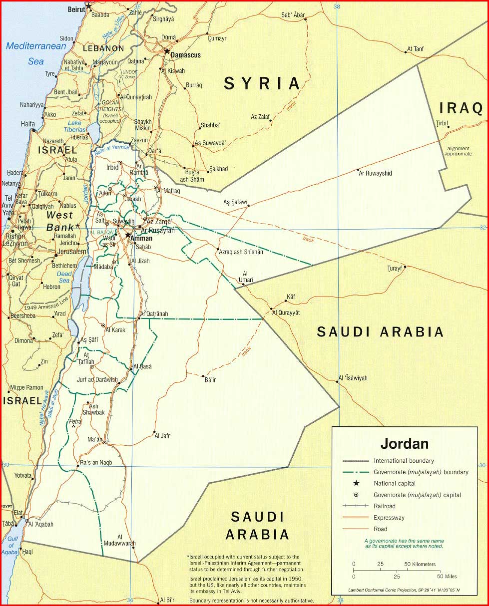 Peta Yordania – Informasi Yordania: Nama resmi Yordania adalah Kerajaan Hasyimiyah Yordania, Al-Mamlaka al-Urduniyya al-Hashemiyya, merupakan sebuah kerajaan yang masuk wilayah Asia dan terletak di Tepi Barat Sungai Yordan. Batas wilayah Yordania meliputi: sebelah timur berbatasan dengan Arab Saudi di timur dan tenggara, Irak di timur-laut, Suriah di utara dan Tepi Barat dan Israel di barat, berbagi kekuasaan atas Laut Mati.