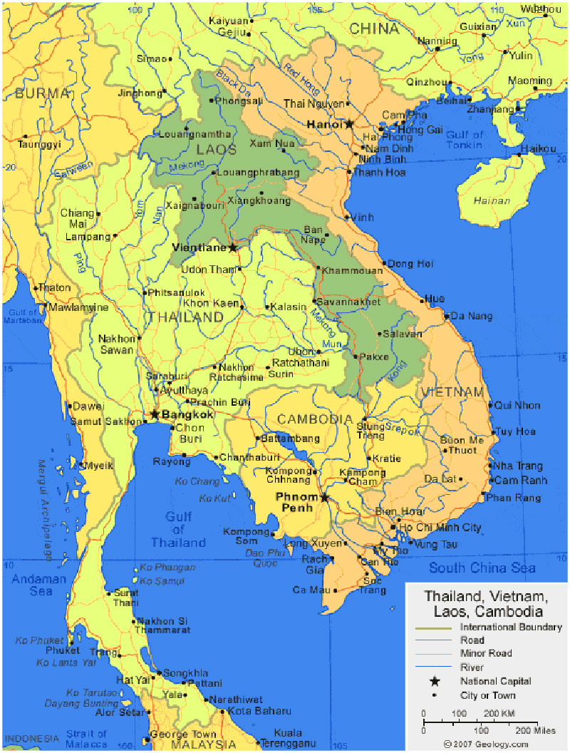 Kampuchea memiliki wilayah seluas 181. 035 km, atau kira-kira seluas P. Sulawesi. Secara fisik, negeri ini menyerupai piring. Dibagian tengah terletak Dataran Besar Tonle Sap. Bagian pinggirnya terbentuk oleh sejumlah pegunungan: Peg. Dong Rak (Phanon Dang Reh) di utara, Peg. Cardamon di barat, plato Rotanokirii dan plato Momdol Kiri di timur. Barisan pegunungan ini memiliki ketinggian 750.900 m. Gunung Phnum Aoral (1.771 m) di Peg. Cardamon merupakan puncak tertinggi di Kampuchea.
