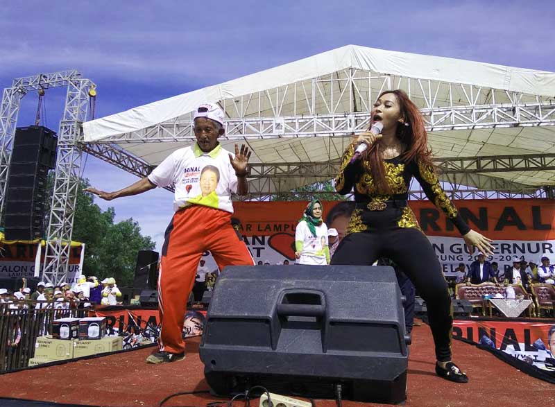 Panggung kampanye partai politik juga tidak ketinggalan memanfaatkan kepopuleran dangdut untuk menarik massa. Isu dangdut sebagai alat politik juga menyeruak ketika Basofi Sudirman, pada saat itu sebagai fungsionaris Golkar, menyanyi lagu dangdut.