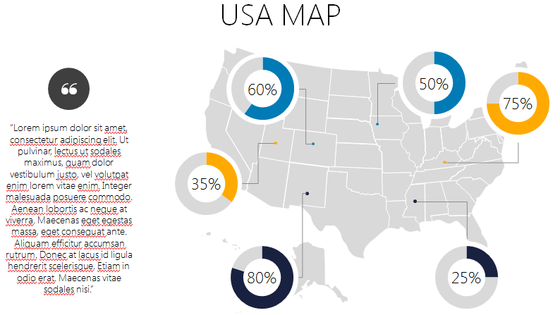 Karena perusahaan Anda beroperasi di AS, kemungkinan ia akan memiliki situs yang berbeda di negara bagian yang berbeda. Dengan slide ini Anda dapat menunjukkan masing-masing fasilitas, dengan menggunakan peta Amerika Serikat dan dengan menyematkan lokasi mereka pada peta. Di sepanjang setiap lokasi situs, Anda dapat memberikan ringkasan singkat mengenai kinerjanya.