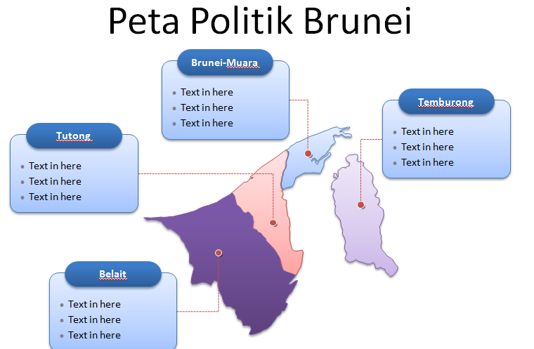 Pada slide ini, Peta Brunei ditampilkan divisi politik negara dari empat distrik, yaitu: Belait, Brunei-Muara, Temburong, dan Tutong. Bagian-bagian tersebut bisa Anda ubah baik teks, warna, maupun ukuran. Arahkan dan Sorot mouse anda untuk menambahkan deskripsi pada masing-masing kabupaten.