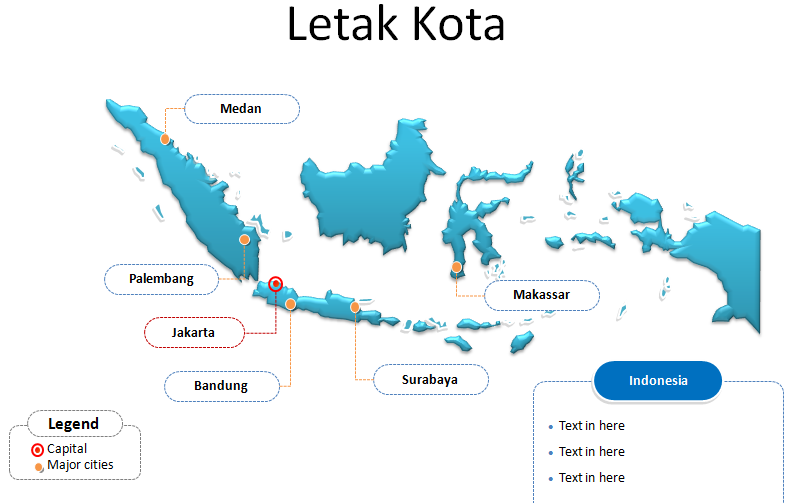 Template PowerPoint Peta Indonesia Gratis – Template peta Indonesia format PowerPoint terdiri dari dua slide saja, yaitu peta Indonesia secara garis besar dan peta Indonesia dengan ibu kota provinsi. Slide pertama menjelaskan batas-batas 34 provinsi, dan slide kedua letak obu kota masing-masing provinsi.