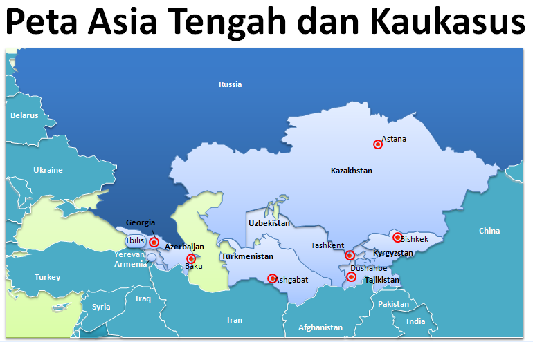 Template PPT Peta Asia Tengah Kaukasus – Asia Tengah memuat 5 negara Asia Tengah, yaitu Kazakhstan, Kyrgyzstan,