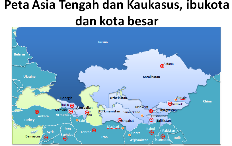 Turkmenistan, dan Uzbekistan. Sedangkan negara Kaukasus meliputi: Georgia, Armenia, Azerbaijan, Turki dan Iran. Pada template ini dilabeli dengan ibukota Asia Tengah, negara-negara Kaukasus dan kota-kota penting dari negara-negara tetangga, seperti Tabriz, Mashad, Heart, Samarkand, dan Almaty.