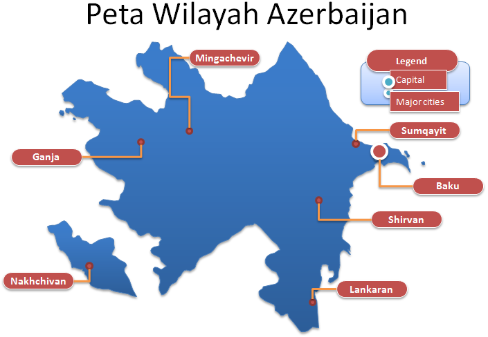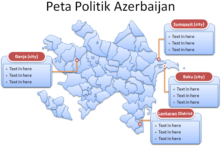 Template PPT Peta Azerbaijan – Peta politik Negara Azerbaijan meliptui 59 distrik, 11 kota dan 1 republik otonom. Kabupaten dan kota besar adalah: Kota Baku, G*nja, Sumqayit, dan Kabupaten Lankaran. Peta Wilayah Azerbaijan ditandai dengan ibukota dan kota besar, yaitu: Baku, Sumqayit, G*nja, Mingachevir, Lankaran, Shirvan, dan Nakhchivan.