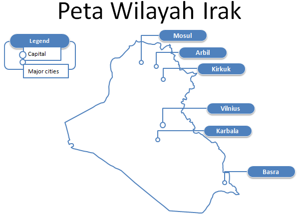 Template PPT Peta Irak – Negara Irak terbagi menjadi delapan belas provinsi, provinsi besar meliputi: Baghdad, Nineveh, Basra, dan Sulaymaniyah. Peta wilayah Irak ditandai dengan ibukota dan kota besar, yaitu: Baghdad, Basra, Mosul, Arbil, Kirkuk, dan Karbala.