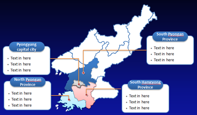 Template PPT Peta Korea Utara – Pada template powerpoint peta Politik Korea Utara terdapat sembilan provinsi dan dua kota khusus. Provinsi besar meliputi ibu kota Pyongyang, Provinsi Pyongan Selatan, Provinsi Pyongan Utara, dan Provinsi Hamgyong Selatan. Ibu kota Korea Utara adalah Pyongyang, dan kota besar lainnya meliputi Hamhung, Chongjin, Nampo, Wonsan, dan Sinuiju.