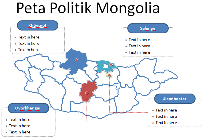 Template PPT Peta Mongolia – Pada peta Mongolia terbagi menjadi 21 Provinsi dan satu kota provinsi. Provinsi utama meliputi: Ulaanbaatar, Khövsgöl, Övörkhangai, dan Selenge. Ibukota Mongolia adalah Ulaanbaatar, dan kota besar lainnya Darkhan, Erdenet, Choibalsan, Mörön, dan Khovd.