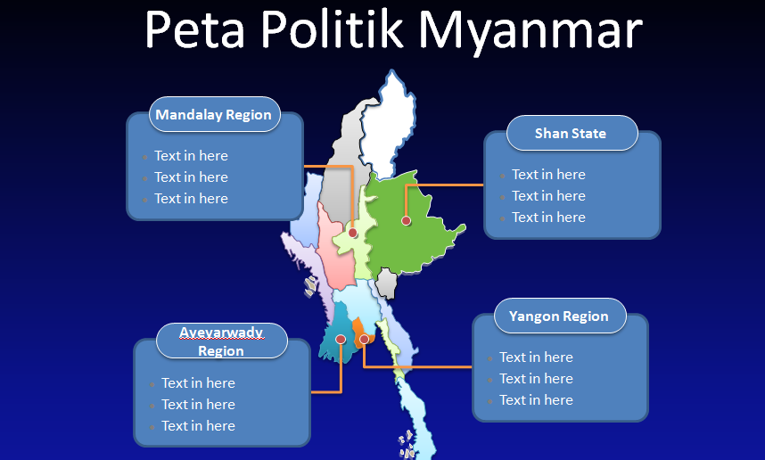 Template PPT Peta Myanmar Gratis – Peta politik Negara Myanmar memuat 14 divisi, terdapat label wilayah dan negara bagian utama, yaitu: Yangon, Ayeyarwady, Mandalay, dan Negara Bagian Shan. Peta outline Myanmar ditandai dengan ibukota dan kota-kota besar, seperti: Yangon, Naypyidaw, Mandalay, Bago, Hpa-An, dan Taunggyi.