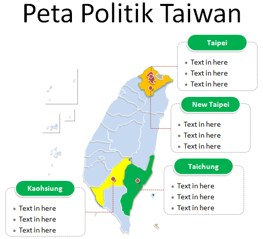 Slide kedua Peta Taiwan ini kami cantumkan 6 kota khusus, 3 kota provinsi dan 13 kabupaten. Pertama, 6 kota khusus adalah Kaohsiung, New Taipei, Taichung, Tainan, Taipei dan Taoyuan; Kedua, 3 kota provinsi adalah Chiayi, Hsinchu dan Keelung. Sedangkan 13 kabupaten yaitu: Changhua, Chiayi, Hsinchu, Hualien, Kinmen, Lienchiang, Miaoli, Nantou, Penghu, Pingtung, Taitung, Yilan, dan Yunlin. Anda dapat mengedit bentuk, menambahkan ikon atau diagram pada slide peta ini.