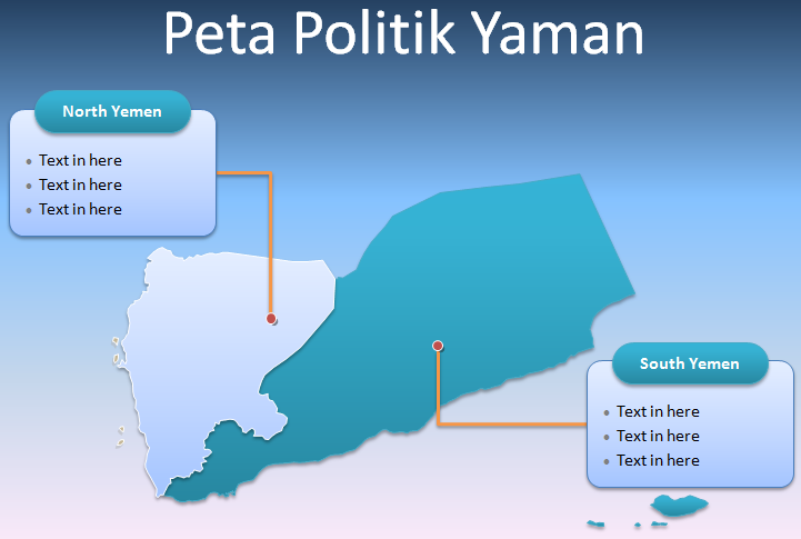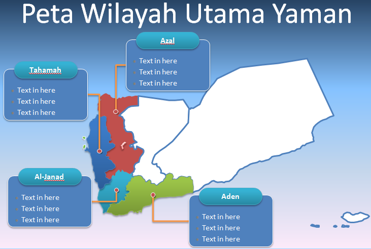 Template PPT Peta Yaman – Negara Yaman terbagi menjadi 20 (duapuluh) provinsi dan satu kotamadya. Distrik besar meliputi: Ta`izz, Al Hudaydah, Ibb, dan Kota San`a’. Peta template wilayah Yaman menyoroti ibu kota dan kota besar, seperti: Sana’a, Aden, Ta’izz, Al Hudaydah, Ibb, dan Dhamar.