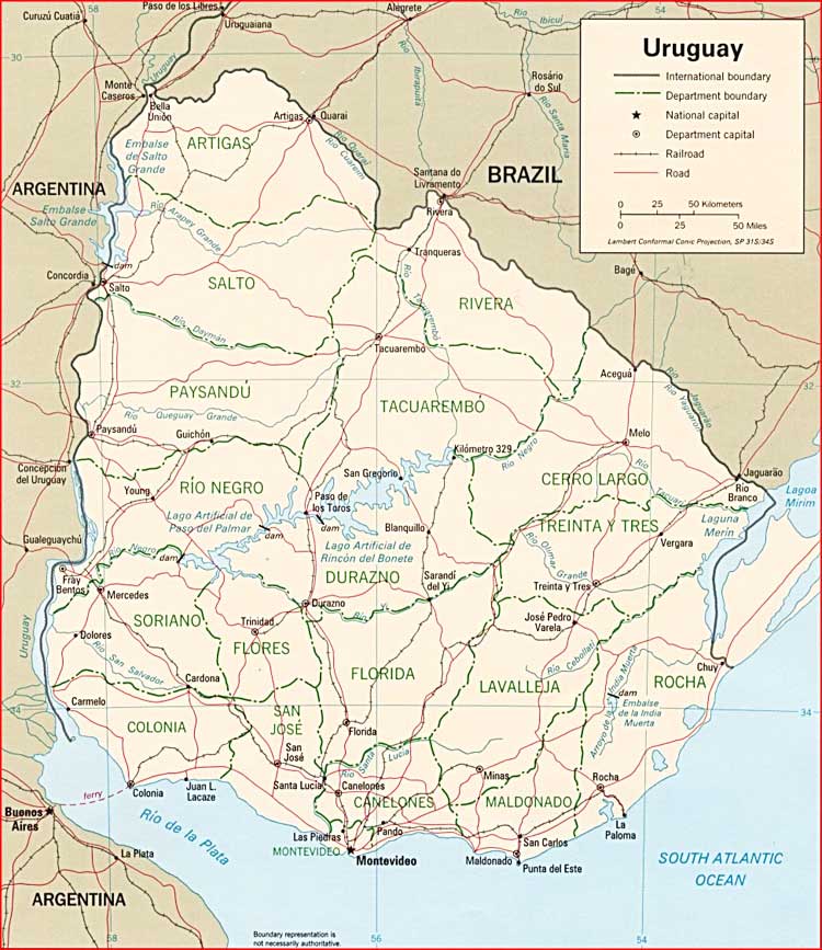 Important Cities of Uruguay: Acegua, Artigas, Canelones, Cardona, Carmelo, Chuy, Colonia, Dolores, Durazno, Florida, Fray Bentos, Guichon, Jose Pedro Varela, Juan L Lacaze, Kilometro 329, La Paloma, Las Piedras, Maldonado, Melo, Mercedes, Minas, Montevideo, Pando, Paso de los Toros, Paysandu, Punta del Este, Rivera, Rocha, Salto, San Carlos, San Gregoria, San Jose de Mayo, Santa Lucia, Sarandi del Yi, Son Jose, Tacuarembo, Tranqueras, Treinta-y-Tres, Trinidad, Vergara and Young.