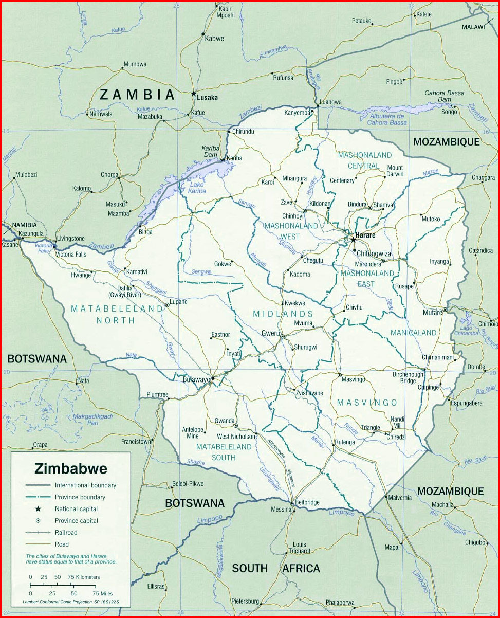 Zimbabwe Map – The official name of Zimbabwe is the Republic of Zimbabwe, a landlocked country located in southern Africa, between the Zambezi and Limpopo Rivers, bordering South Africa, Botswana, Zambia and Mozambique. The capital and largest city is Harare. The population of Zimbabwe is around 16 million people, has 16 official languages, with English, Shona and Ndebele the most commonly used.